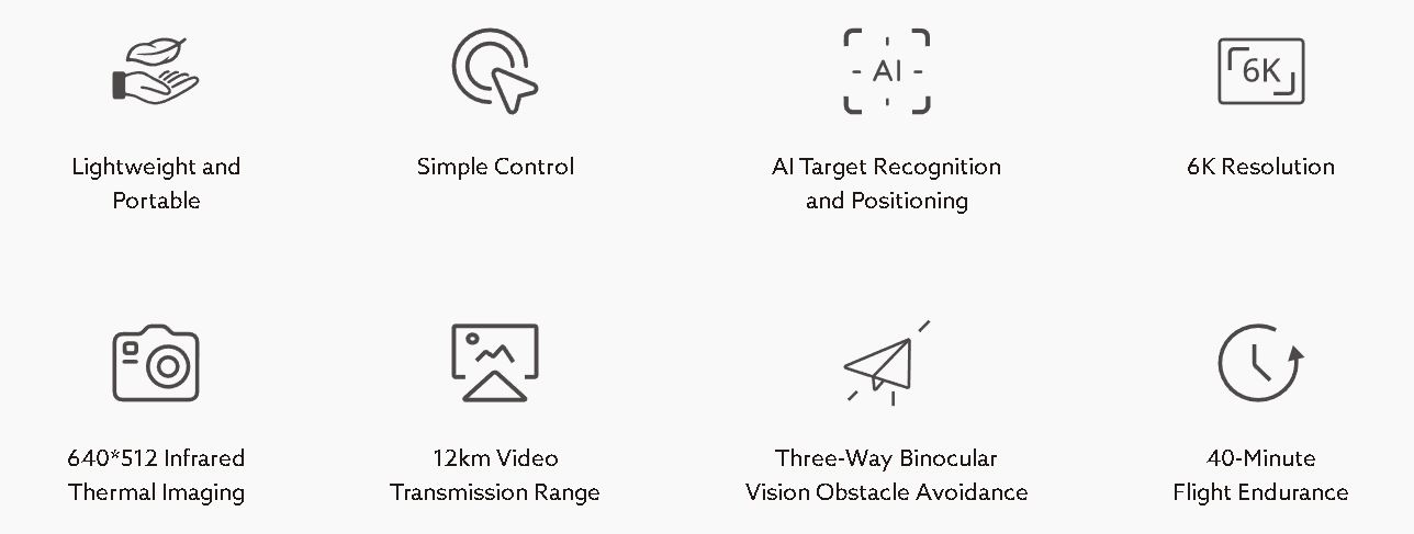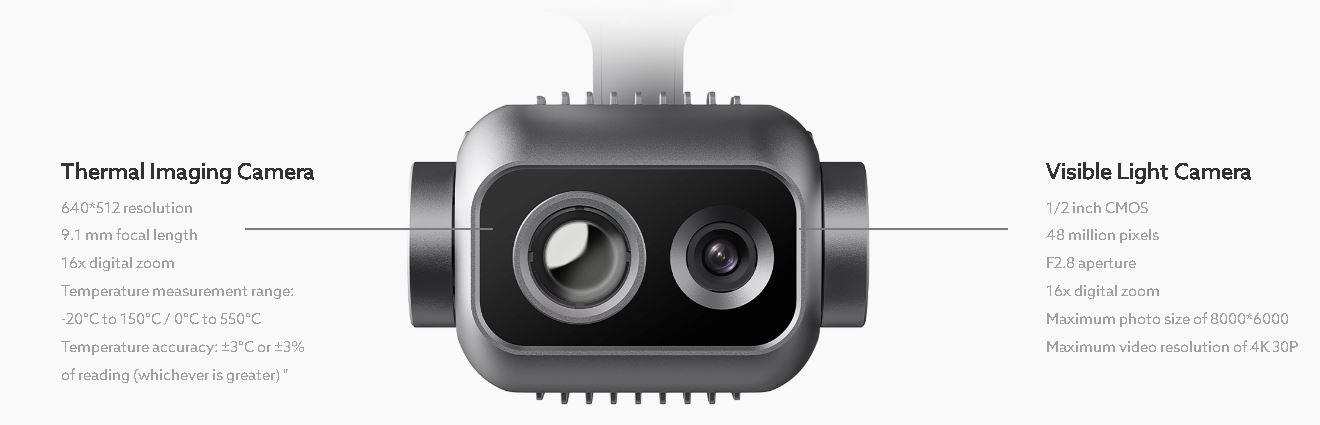 Оборудван с двойна камера- широкоъгълната камера с видима светлина предлага широко зрително поле с ярки изображения с висока разделителна способност, докато инфрачервената термовизионна камера интегрира термични алгоритми с висока разделителна способност, осигуряващи ясна и подробна идентификация на топлинния източник .