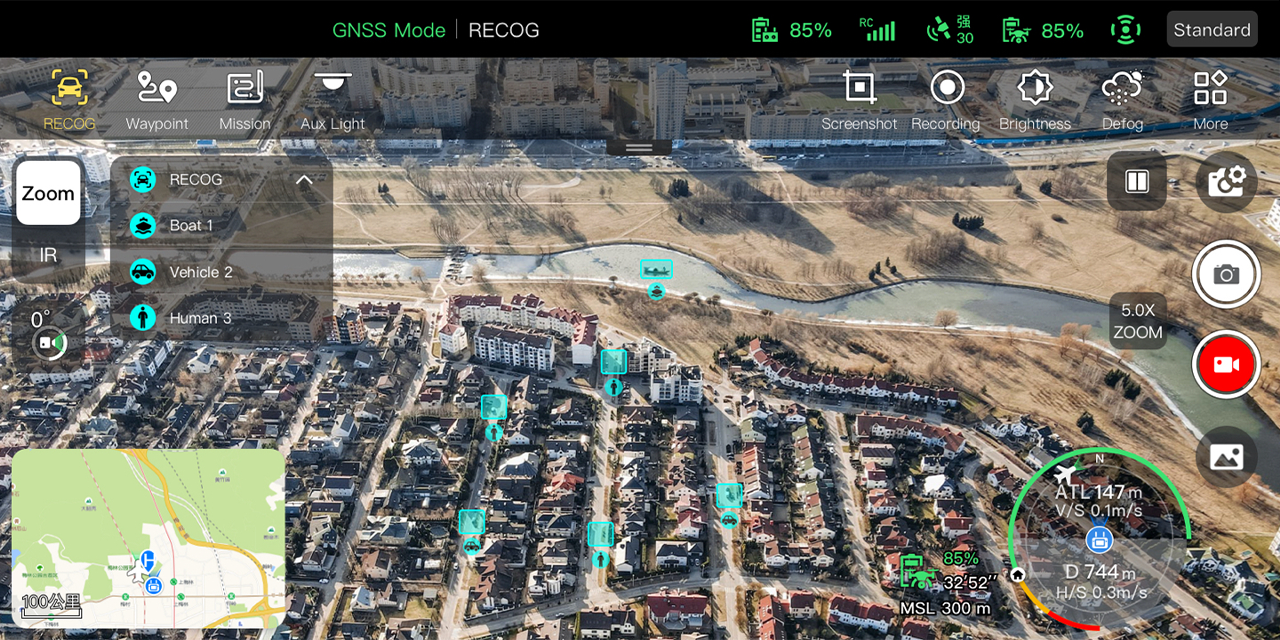 Използвайки широкоъгълни или термовизионни камери, комбинирани с интелигентни AI алгоритми и самообучаваща се система, дронът може автоматично да разпознава и локализира, включително хора, коли, лодки и фойерверки, проектирайки техните позиции на картата.