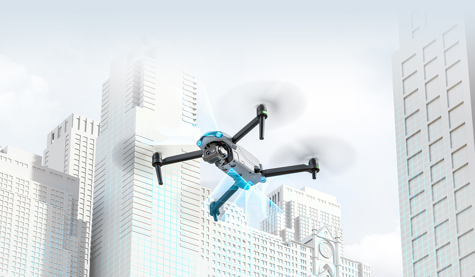 Дронът е оборудван със сензори за широкоъгълно виждане отпред, отзад и отдолу, осигуряващи надеждна безопасност на полета.