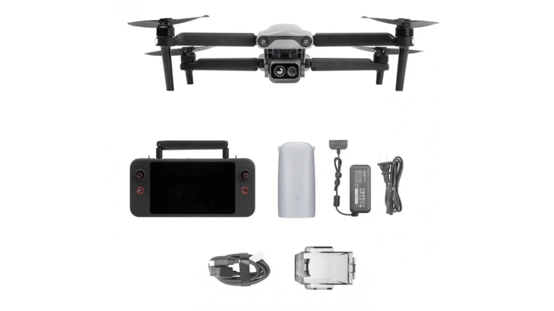 Комплектът включва три батерии на дистанционното управление и едно многопортово зарядно устройство, което отговаря на нуждите за продължителни операции. Многопортовото зарядно устройство за дистанционно управление поддържа зареждане на до четири батерии на дистанционното управление едновременно.