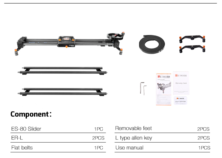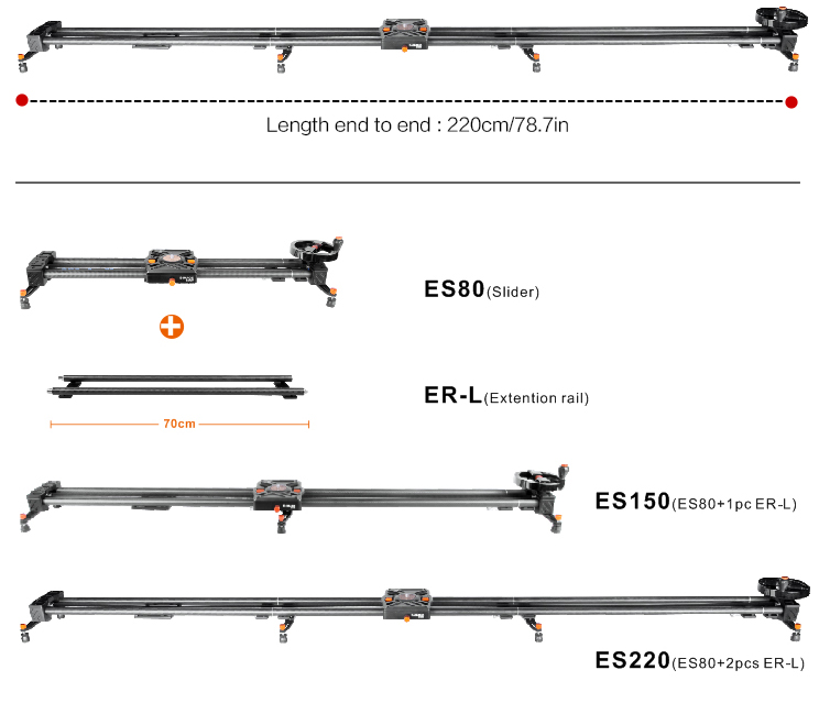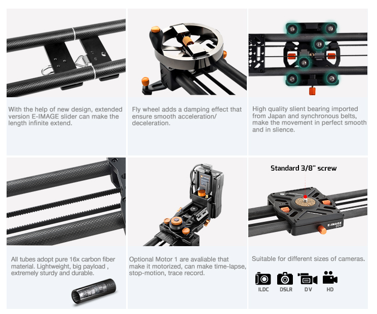 E-IMAGE нов разтегателен слайдър, който позволява безкрайно удължаване на плъзгача чрез добавяне на всеки 70 см карбонови тръби. Предлага се с претеглен маховик, прикрепен към края на слайдера, осигуряващ дръжка за гладки и прецизни ръчно задвижвани движения. Може също да работи с E-IMAGE Motor 1, за да работи моторизирано , за постигане на повече функции за заснемане.