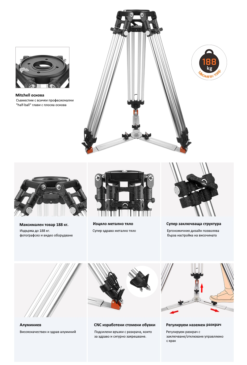 FILM-Mitchell L e професионалen статив за големи натоварвания, който е изключително стабилен и здрав и специално проектирани за студийни, видео и големи филмови камери.